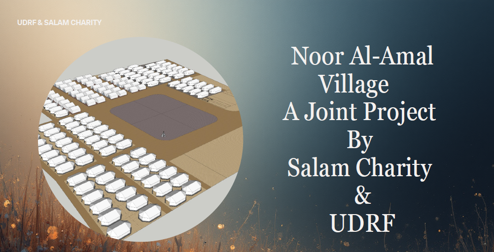 UDRF and Salam Charity USA have joined together to build Noor Al-Amal Village, a lifeline for hundreds of displaced families in Gaza. This village will provide safe shelter and all essential services—including schools, medical clinics, clean water, food distribution, and other critical amenities.